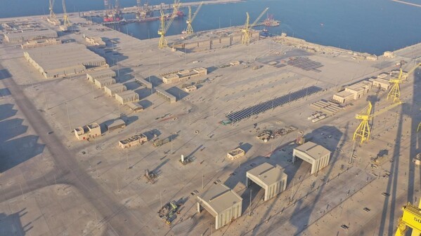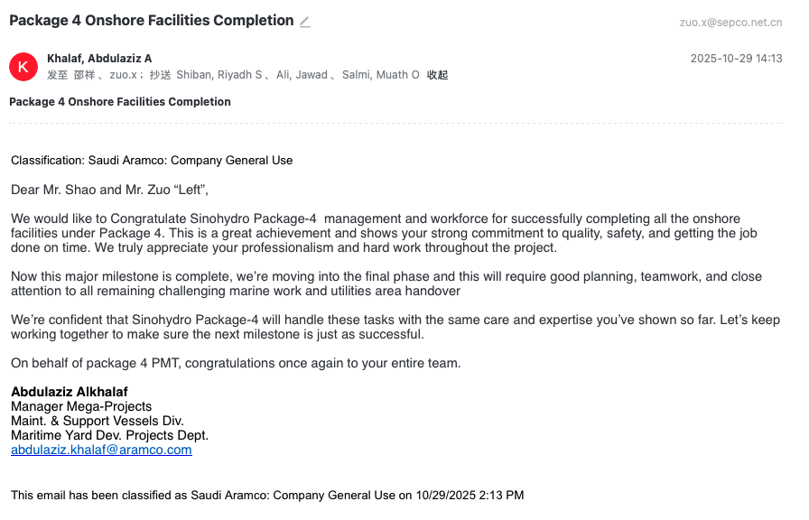 2025年10月30日,由水電五局承建的沙特國王港項目P4包在沙特阿美業主會議室舉行陸域建筑物全面移交慶典。P4包率先完成全部陸域建筑物移交任務。 P4包陸域建筑物共48個單體,工程規模宏大、技術復雜、環境艱苦。10月29日,隨著最后一個單體——B303多功能綜合大樓完成全部尾項消缺并順利移交,標志著P4包陸域建筑物移交任務全面告捷,項目建設進入最后沖刺階段。P4包業主項目經理哈拉夫(Khalaf)發來感謝信,信中寫道:“這一成就彰顯了你們對質量、安全和按時完成工作的堅定承諾。我們由衷感謝你們在整個項目期間展現的專業精神和辛勤工作。” 沙特國王港項目位于沙特東部省朱拜勒市拉斯海爾工業園區,由薩勒曼國王親自奠基并命名,是沙特“2030愿景”的重要組成部分。本項目創造了多個世界之最:占地面積11.25平方公里——全球規模最大的超級船廠;巨型龍門吊聯合吊裝重量達2100噸——吊裝能力位居全球前列;25000噸的升船能力——全球最大的升船機系統;碼頭總長7公里——全球最長的碼頭。 |