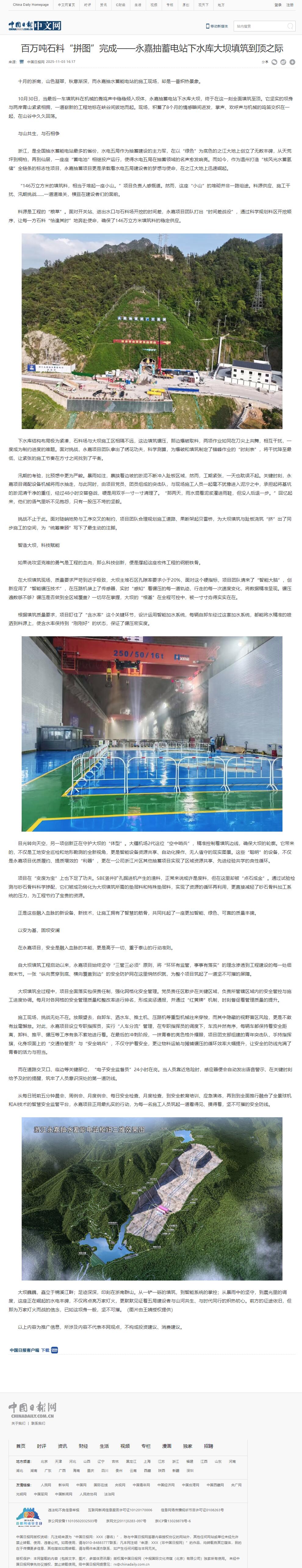 中國日報:百萬噸石料“拼圖”完成——永嘉抽蓄電站下水庫大壩填筑到頂之際